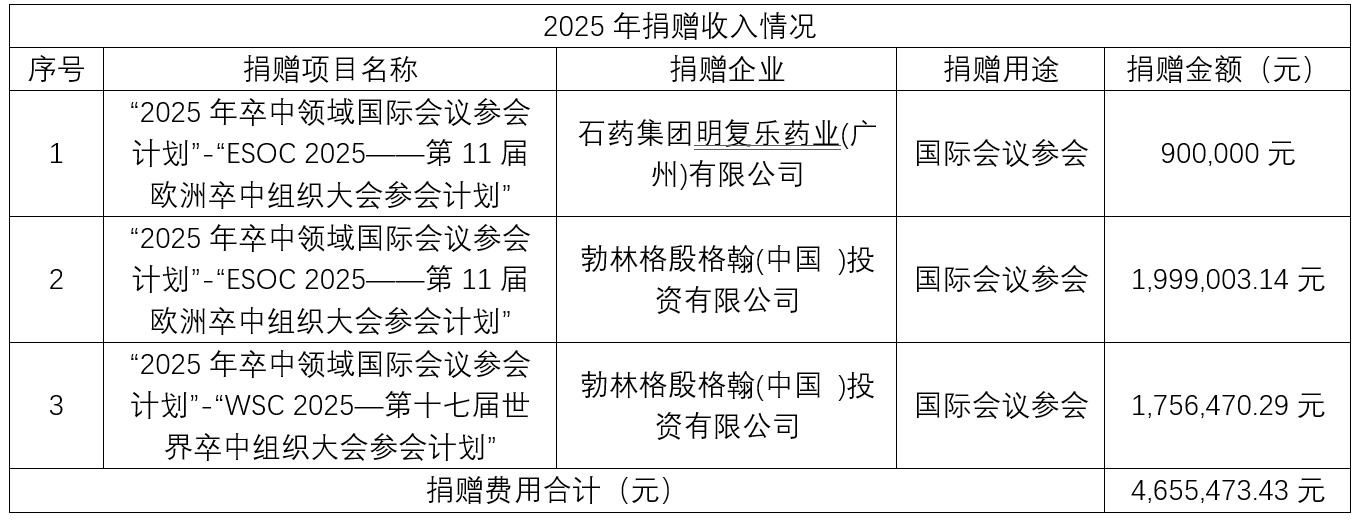 自2025年1月1日至2025年12月20日,中国卒中学会收到石药集团明复乐药业(广州)有限公司,项目捐赠款900,000元;勃林格殷格翰(中国 )投资有限公司,项目捐赠款3,755,473.43元;合计捐赠金额:4,655,473.43元。