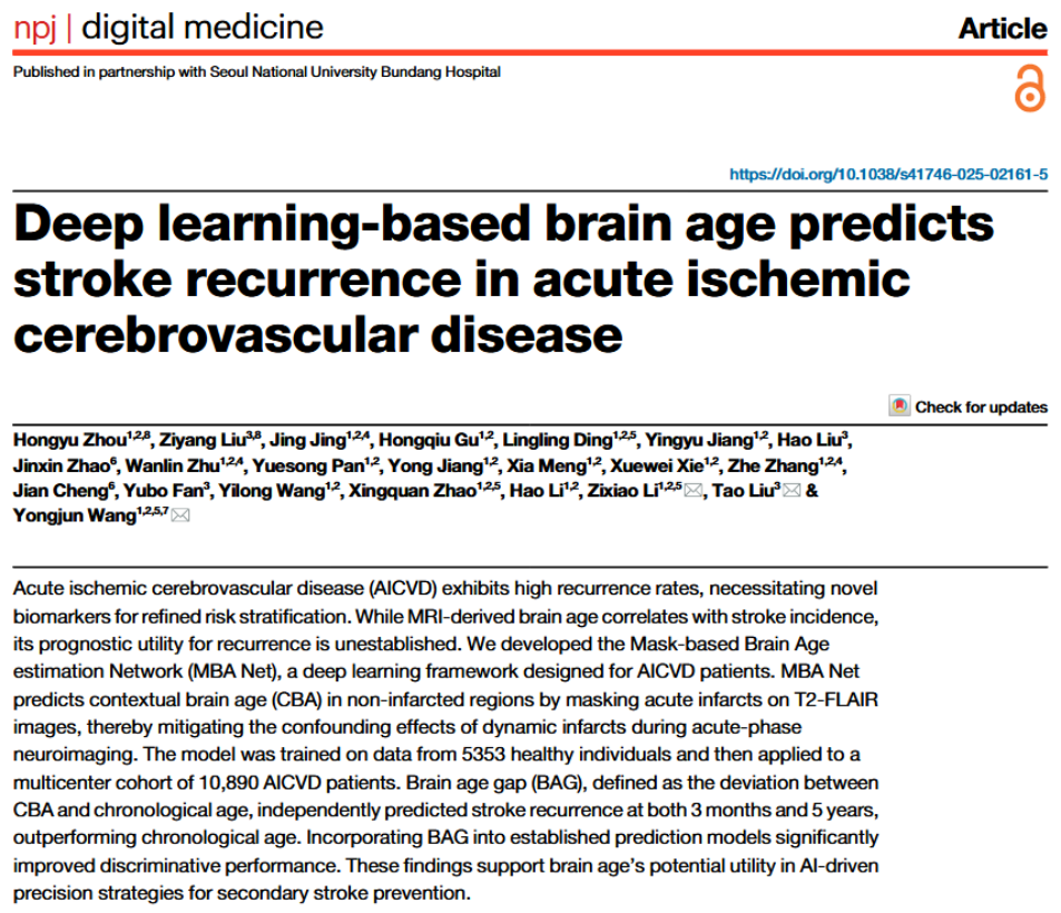近日,首都医科大学附属北京天坛医院王拥军院士团队联合北京航空航天大学刘涛教授团队在《npj Digital Medicine》发表题为「Deep learning-based brain age predicts stroke recurrence in acute ischemic cerebrovascular disease」的研究论文。