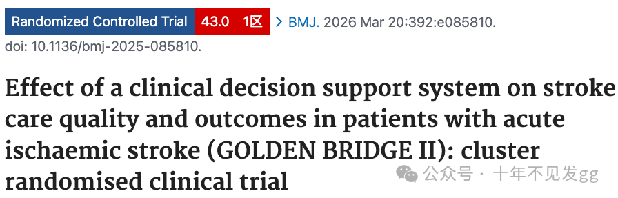 国际顶级医学期刊《BMJ》(英国医学杂志)2026年第392卷的GOLDENBRIDGEII研究(金桥工程II),由首都医科大学附属北京天坛医院李子孝/王拥军教授团队牵头,联合国内多中心及国际相关领域专家共同完成,研究开展了一项覆盖中国77家医院的多中心、整群随机对照临床试验,共纳入2021年1月至2023年6月期间21603例发病7天内的急性缺血性卒中患者,将38家医院分配至干预组(应用整合了AI辅助影像分析、卒中病因自动分型、循证诊疗推荐等核心功能的卒中临床决策支持系统CDSS)、39家医院分配至对照组(实施常规临床诊疗),以发病3个月内新发血管事件(缺血性卒中、出血性卒中、心肌梗死及血管性死亡的复合终点)为主要结局,同时评估了卒中诊疗质量绩效指标、6/12个月远期血管事件、残疾率、全因死亡率及出血相关安全性终点,最终研究证实,在急性缺血性卒中患者诊疗中应用该卒中CDSS,可使患者3个月内新发血管事件风险显著降低26%(干预组2.9%vs对照组3.9%,调整后HR=0.74,P=0.01),12个月新发血管事件风险同样显著下降,同时显著提升了卒中循证诊疗的复合质量指标(91.4%vs89.8%,P<0.001),尤其大幅改善了双抗治疗、房颤抗凝、吞咽困难筛查、深静脉血栓预防等基线依从性偏低的关键诊疗措施的执行率,且两组在中重度出血事件、全因死亡率、残疾率方面无显著差异,明确了该CDSS在改善急性缺血性卒中患者临床预后、提升诊疗质量方面的有效性与良好安全性,为卒中高负担、医疗资源有限地区提供了一种高效、可规模化推广的AI辅助卒中全流程管理工具。