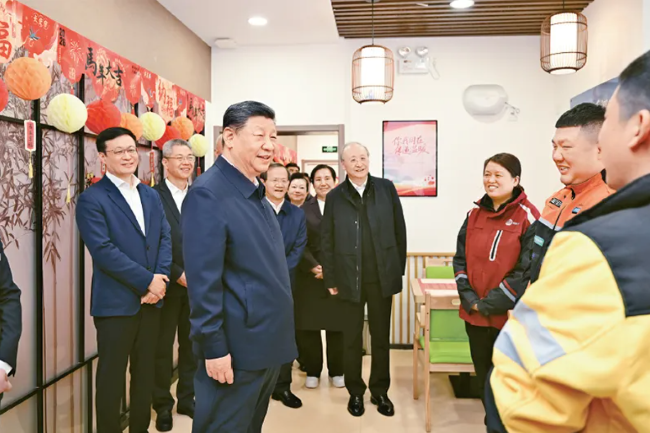 2026年2月9日至10日,中共中央总书记、国家主席、中央军委主席习近平在北京考察并看望慰问基层干部群众。这是10日上午,习近平在西城区新街口街道父母食堂考察时,同在这里休息的快递小哥亲切交流。 新华社记者 谢环驰/摄